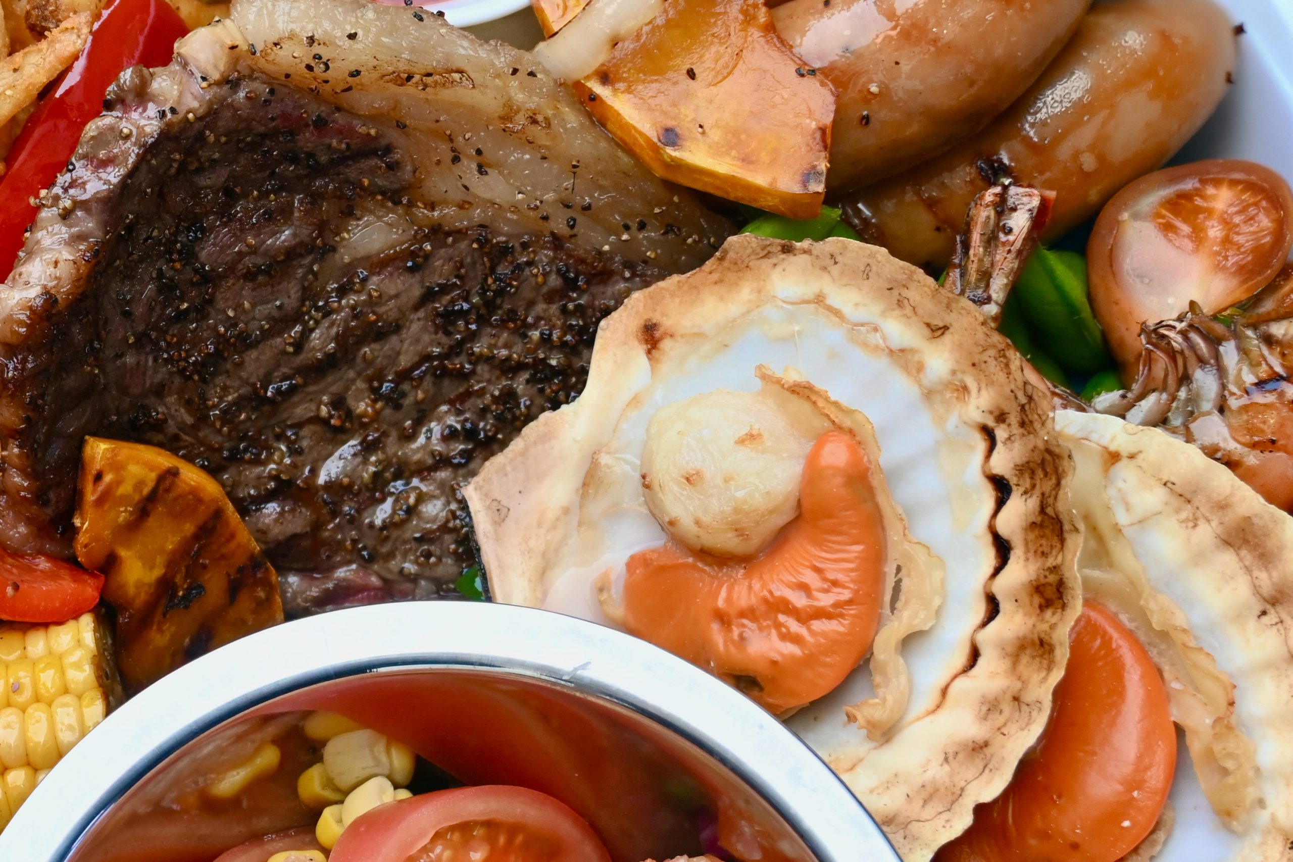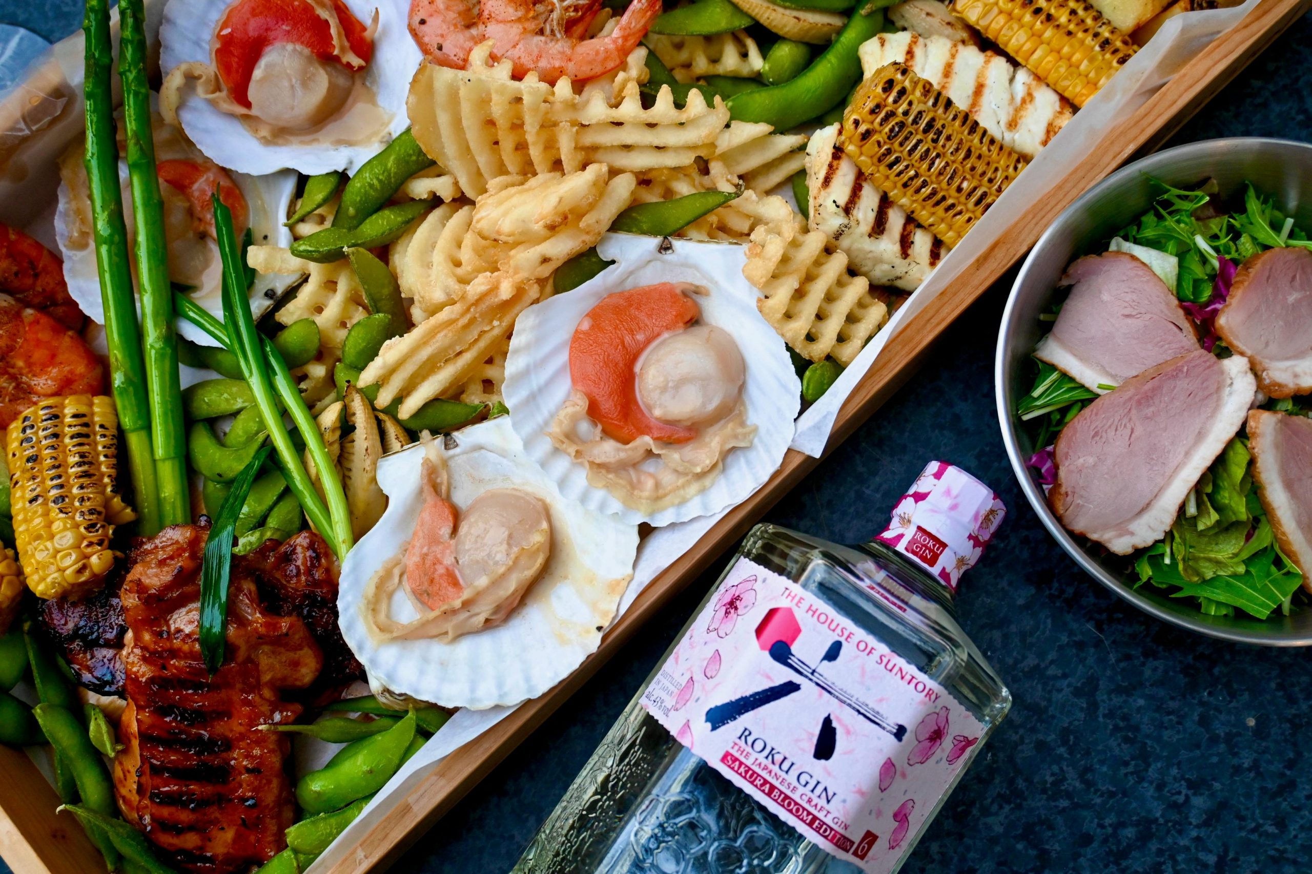 帆立貝のグリル 味噌バター | 海老のバーベキュー ガーリックと春ハーブ | 鯛のグリル | 国産牛サーロイン山葵醤油、鶏の照り焼き 青葱添え |