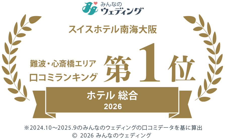 「みんなのウェディング」2026口コミランキングにて、大阪 難波・心斎橋エリア総合1位を受賞いたしました!